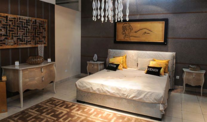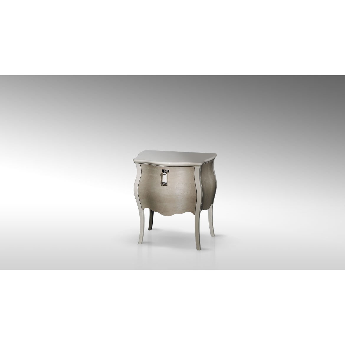 The chest of drawers and bedside tables CANOVA from Fendi Casa are made of lacquered wood, curved legs go into the corners of the case, the contour of the walls and the lid with bends, a drawer with an overhead strap handle.