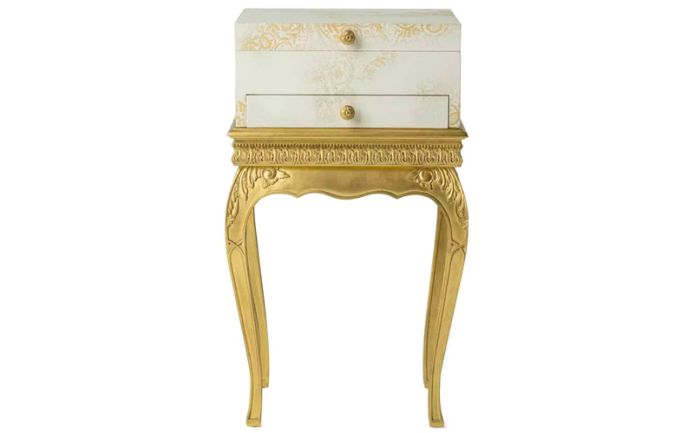 The pieces of the Brocart line showcase a refined style that evokes the luxury of the 17th and 18th century French noble courts. They present a base with hand-carved legs and antique gold-leaf finishes in pure classic style, combined with an upper part featuring a more essential and linear volume. The ornamental theme evokes the Cantù lace, a motif of the Italian manufacturing tradition, present in the Cantù territory since the XVIIth century, and is achieved through a special laser processing that allows carving of the top layer of lacquer to create the design.
