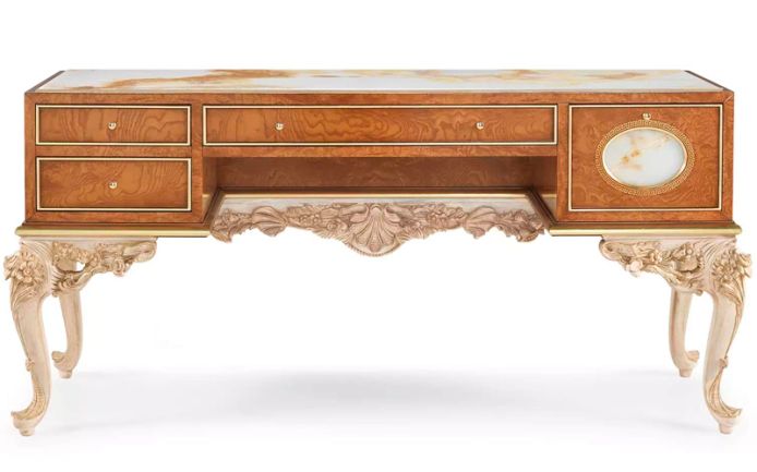 Elegant, luxurious and timeless, La Grande Dame furniture line is a tribute to the most authentic classic style. The dressing table is characterized by a precious hand-carved beechwood base in Louis XV style with finish in walnut and patinated white and gold. The structure is in walnut with brass inlays and marble inserts, like the top.