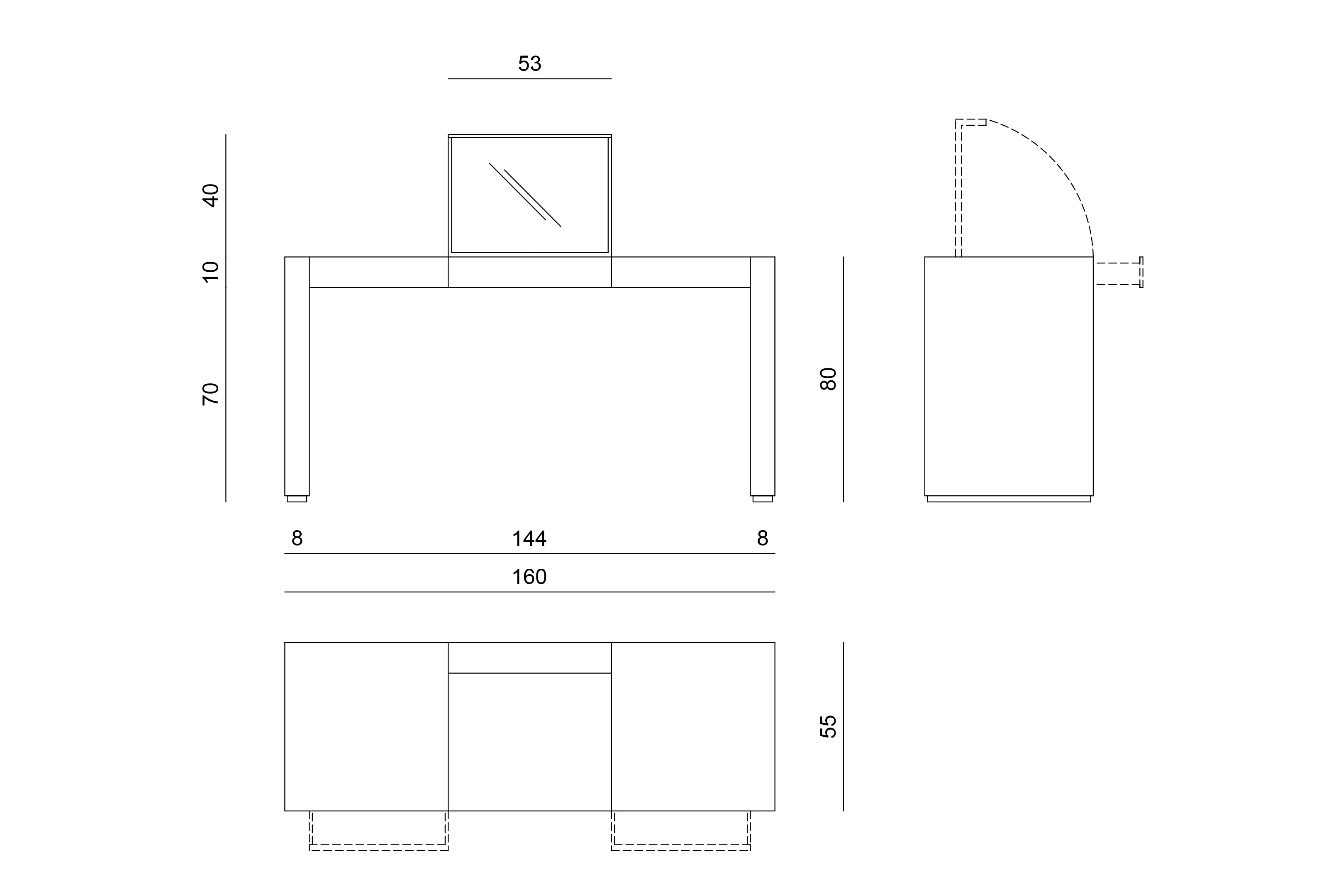 Structure in honeycomb plywood with panels in MDF. Central top with compass opening, provided with an internal mirror with bevelled border. The two drawers are assembled on an integrated runners, for a guided closing.