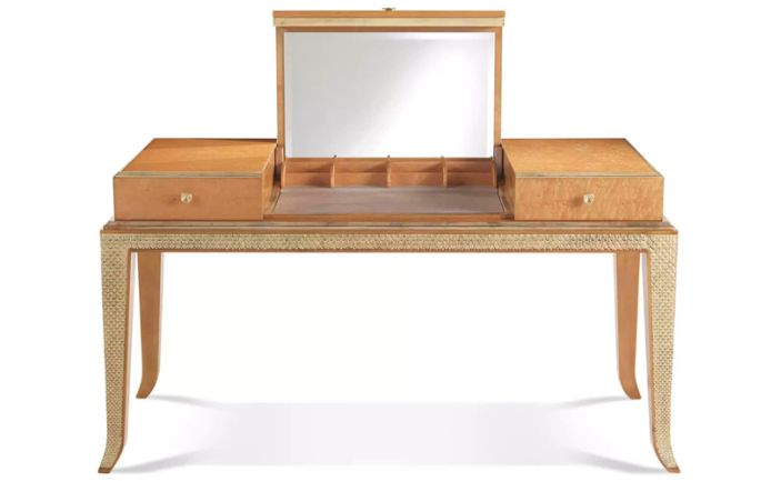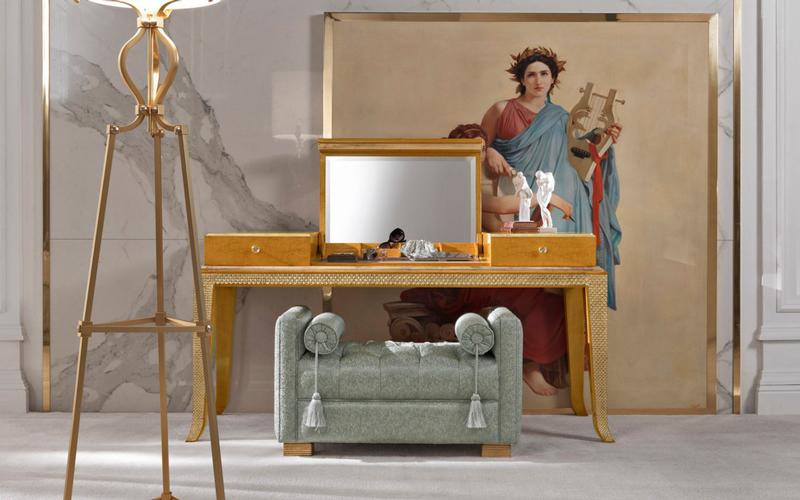 Pleasure is a line of furnishings with linear and essential shapes, characterized by an elegant and refined charm. The dressing table of the collection, in deco style, features a structure in maple with glossy finishing, details with antique gold finishing and marble top. The central compartment with mirror features an inner upholstery in leather.