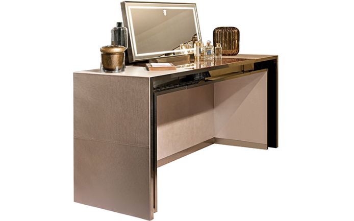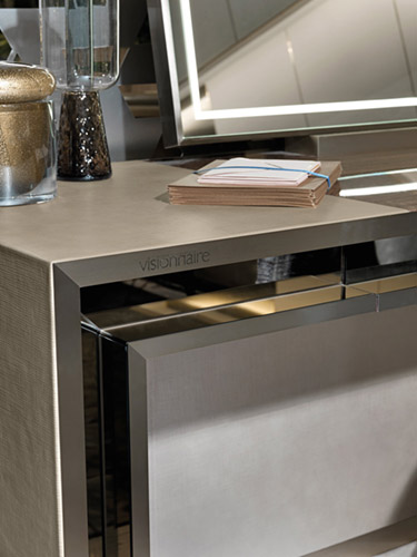 Structure in plywood and MDF fully covered in leather, internal drawer in mat lacquer (RAL colours), front built-in perimetral frame in mirror (natural/bronze/smoked).