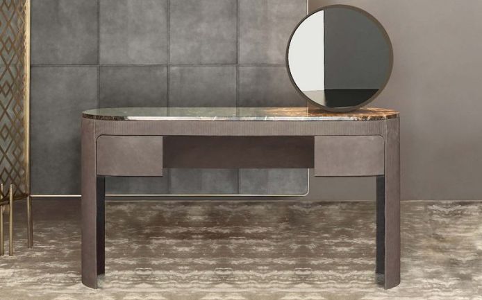 Dressing table with rotating mirror and marble countertop. Large drawers on the sides.