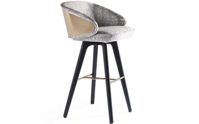 Bar stool with structure in multilayer wood and foam. Upholstery in fabric or leather from the collection. Wooden legs in embossed Black or Ivory Lacquered finishing with footrest in Gold finishing. Optional metal back in Gold finishing.