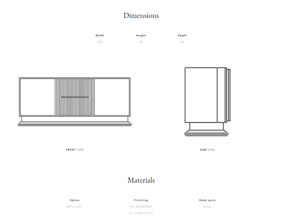 Solid wood and plywood frame. Metal handle details and base. Top and doors available in canaletto walnut and makassar ebony veneer.