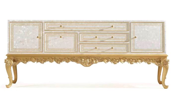 A refined combination of styles and precious materials gives life to a table with a great visual impact. Coquille is characterized by a structure in wood and mother of pearl with hand-made gold decorations and hand-carved base. A scenographic piece of furniture, suitable for settings with a classic and luxurious charm.