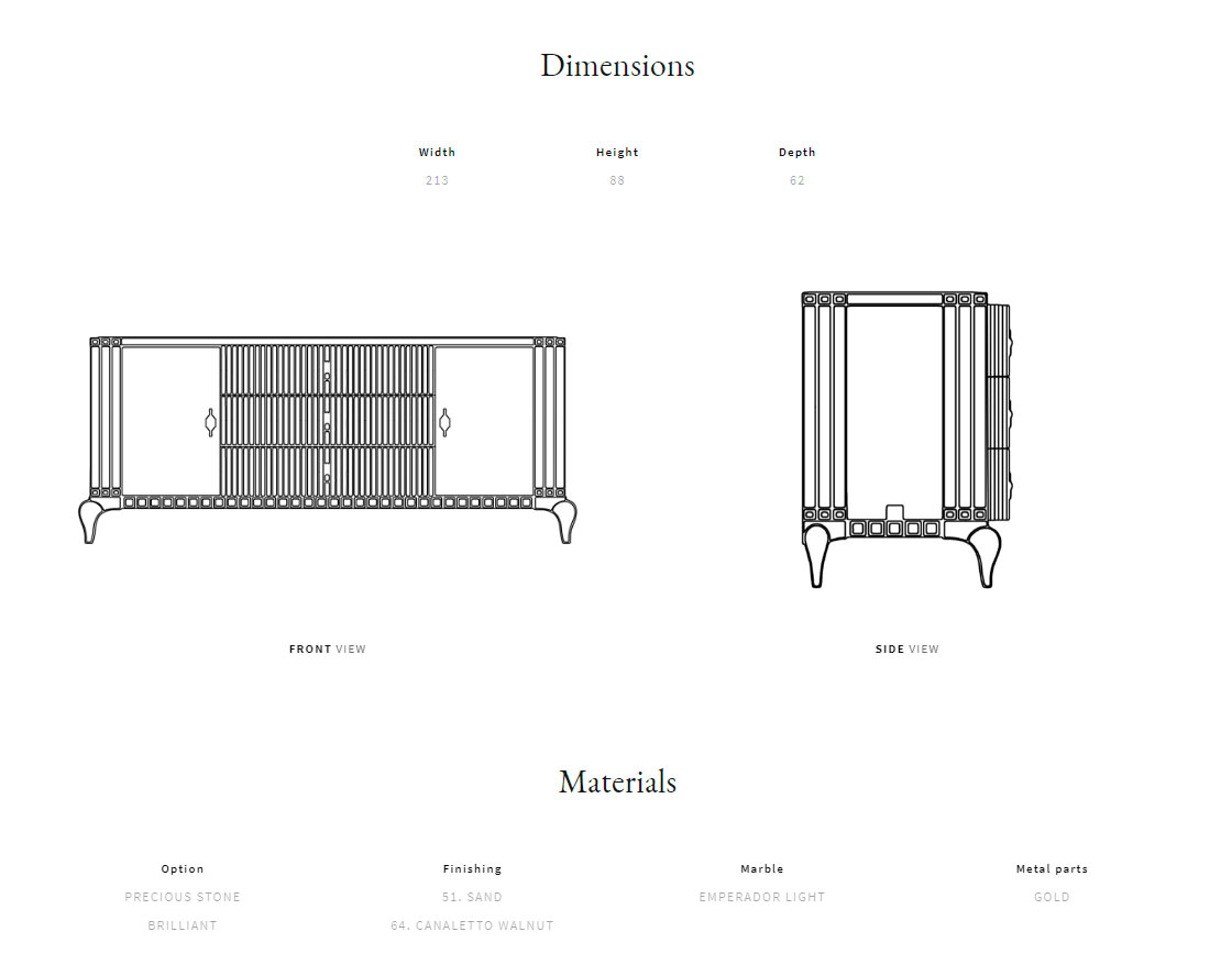 Solid wood and plywood frame. Hand-carved feet. Top available in canaletto walnut veneer or marble. Brass handles.