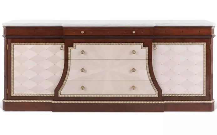 Classic lines and elegant finishes: Etoile sideboard is a masterpiece of cabinetmaking. The walnut structure is enriched with natural maple inserts and details with antiqued and patinated gold leaf finish which add a refined note to the whole.