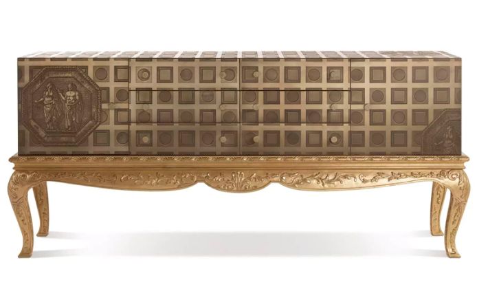 Fragonard line expresses Jumbo Collection’s design approach, where artisanal heritage, decorativism and experimentation in the use of materials, techniques and processes meet. In the Fragonard sideboard, the base is highlighted by the very antiqued gold leaf finish while the structure is enriched with renaissance decorative elements recreated through an innovative engraving technique: the use of liquid metal gives an original embossed effect to the patterns.