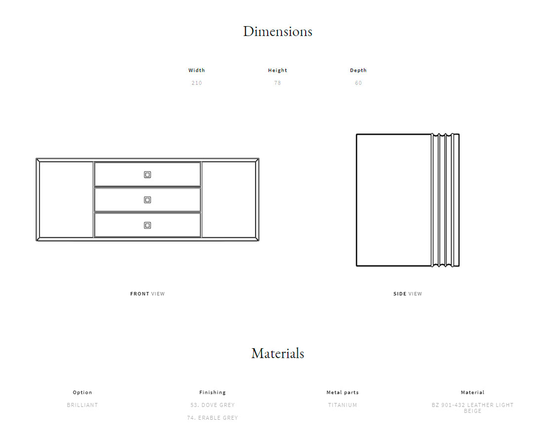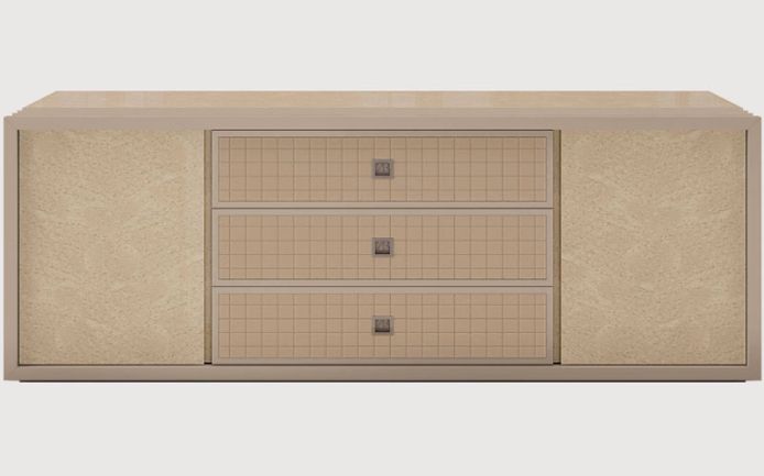 Solid wood and plywood frame. Top and doors available in makassar ebony or grey erable veneer. Quilted leather drawers. Brass handles.
