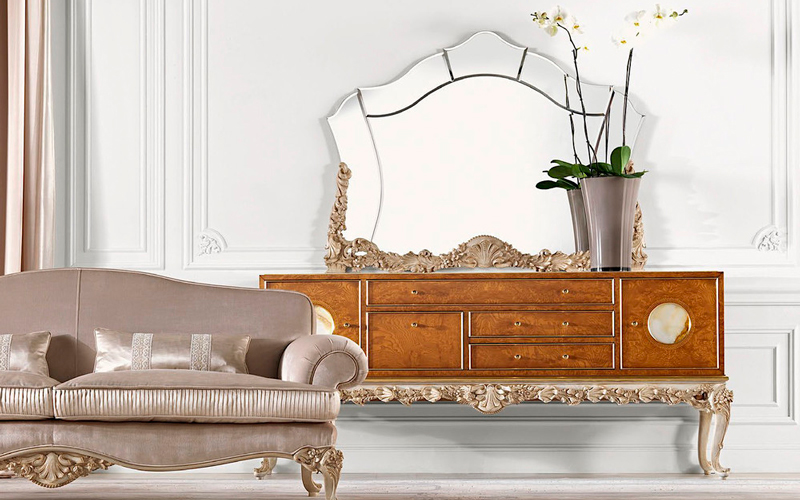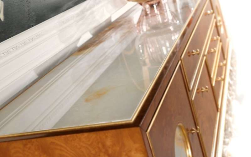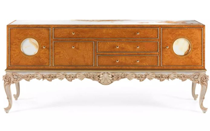 Elegant, luxurious and timeless, La Grande Dame furniture line is a tribute to the most authentic classic style. The sideboardS of the line are characterized by a precious hand-carved beechwood base in Louis XV style with finish in walnut and patinated white and gold. The structure is in walnut with brass inlays and marble inserts, like the top.