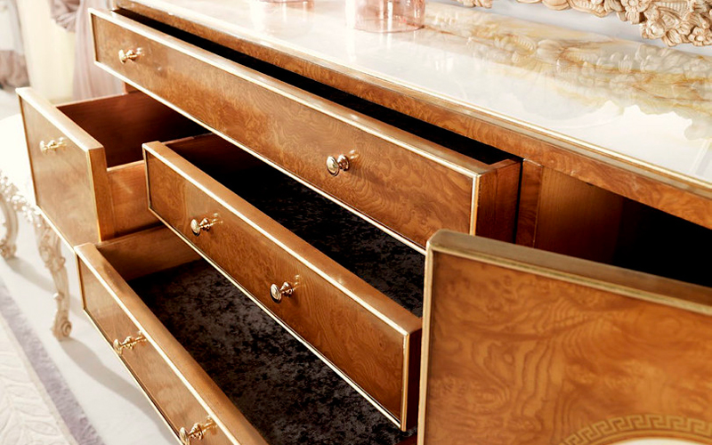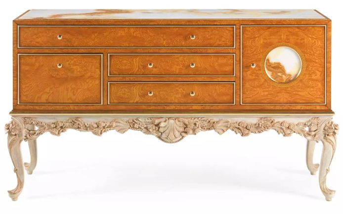Elegant, luxurious and timeless, La Grande Dame furniture line is a tribute to the most authentic classic style. The sideboardS of the line are characterized by a precious hand-carved beechwood base in Louis XV style with finish in walnut and patinated white and gold. The structure is in walnut with brass inlays and marble inserts, like the top.