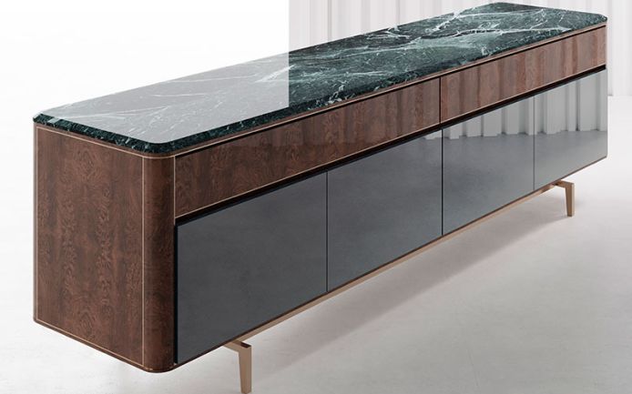 Low cabinet with four doors and two drawers. Structure in MDF covered in wood with inserts in satin stainless steel embedded in the wood. Wooden doors carved in low relief with diamond pattern, marble top.