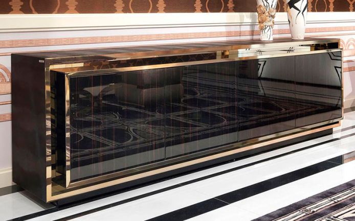 Unit with double depth with 4 doors or 4 drawers and push-pull opening. The doors and drawers can be lacquered and polished or in veneered wood. Mat lacquered inside (RAL colours), top and laterals upholstered in leather.
