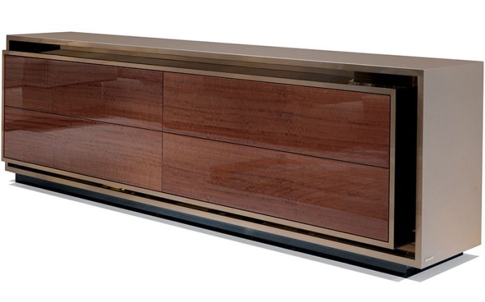Unit with double depth with 4 doors or 4 drawers and push-pull opening. The doors and drawers can be lacquered and polished or in veneered wood. Mat lacquered inside (RAL colours), top and laterals upholstered in leather.