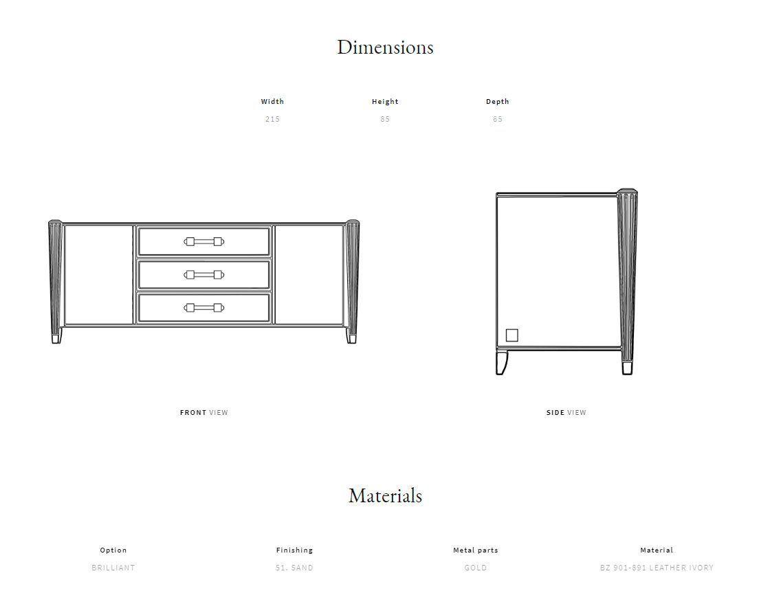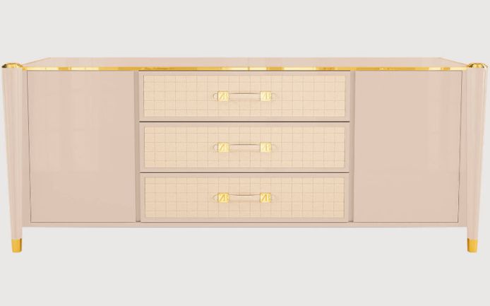 Solid wood, plywood and MDF frame. Lacquered wooden top. Quilted leather side parts and drawers. Brass handles and details. Wooden columns with fluted decorations.