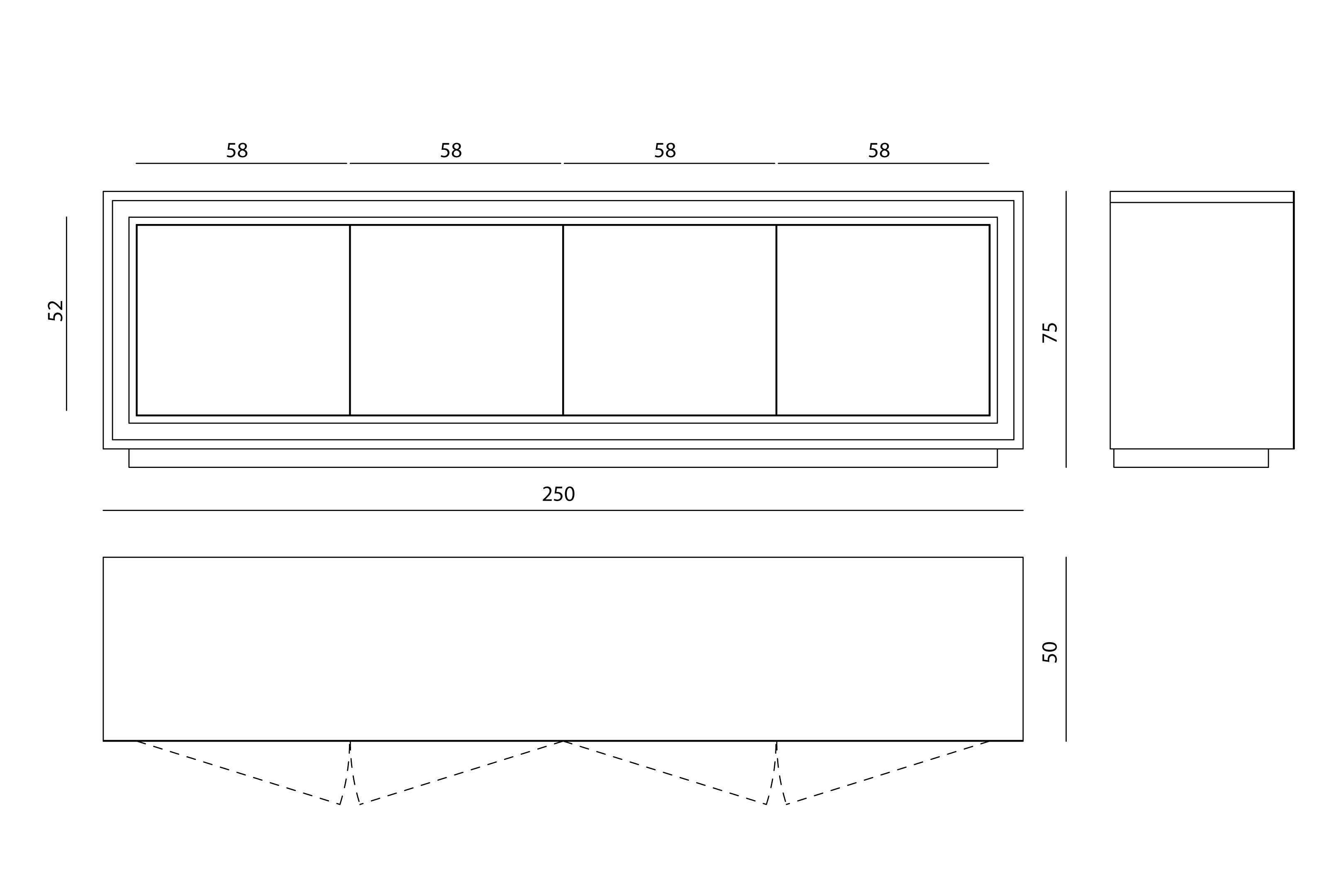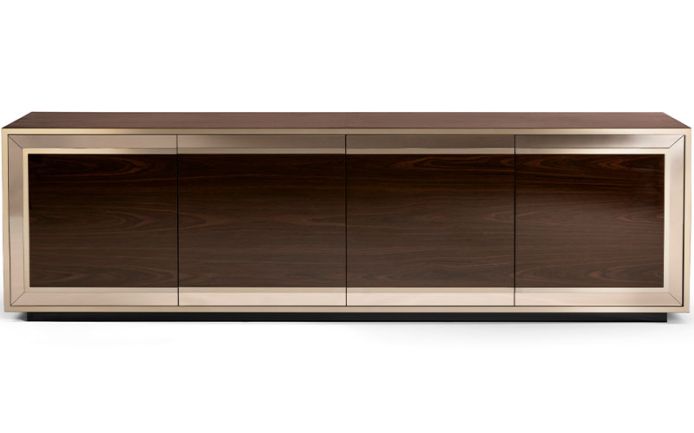 Low cabinet with four doors upholstered in leather. Doors with push-pull opening in wood, available with RAL/NCS lacquer finish or veneer finish. Internal parts with matt lacquer finish (RAL/NCS colours).