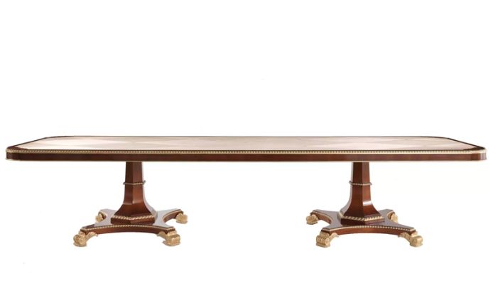 Classic lines and elegant finishes: the "Etoile" dining table is a masterpiece of cabinetmaking. The walnut structure is combined with a top with natural maple insert. The details with antiqued and patinated gold leaf finish and the brass inlays add a refined note to the whole.