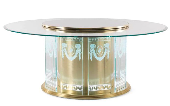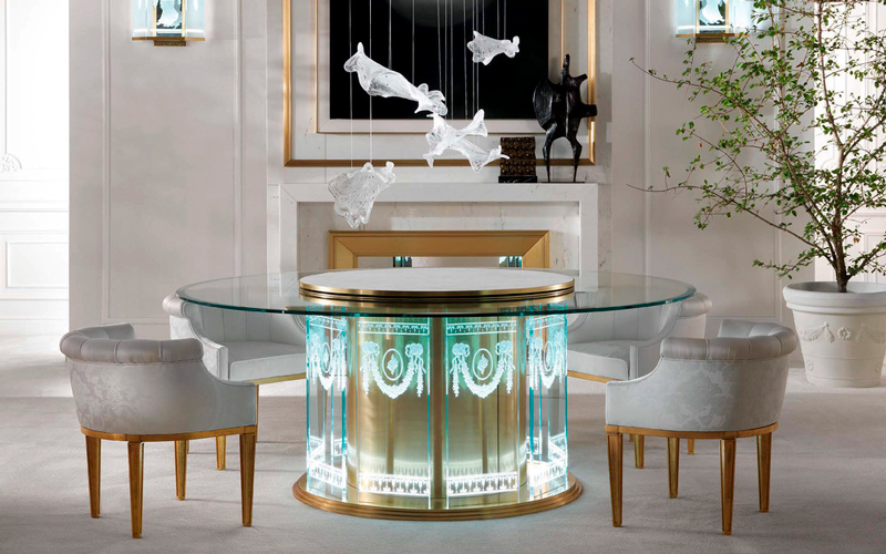 A scenographic dining table that demonstrates Jumbo Collection’s technical and artistic skills. The special manufacturing of the glass, engraved in several steps and with different depths, gives a three-dimensional effect to the drawings, studied ad hoc on the piece. The lighting takes place through the thickness of the glass and allows the engraved elements to be highlighted: bamboo, herons, peach blossoms and other elements inspired by the Orient.
