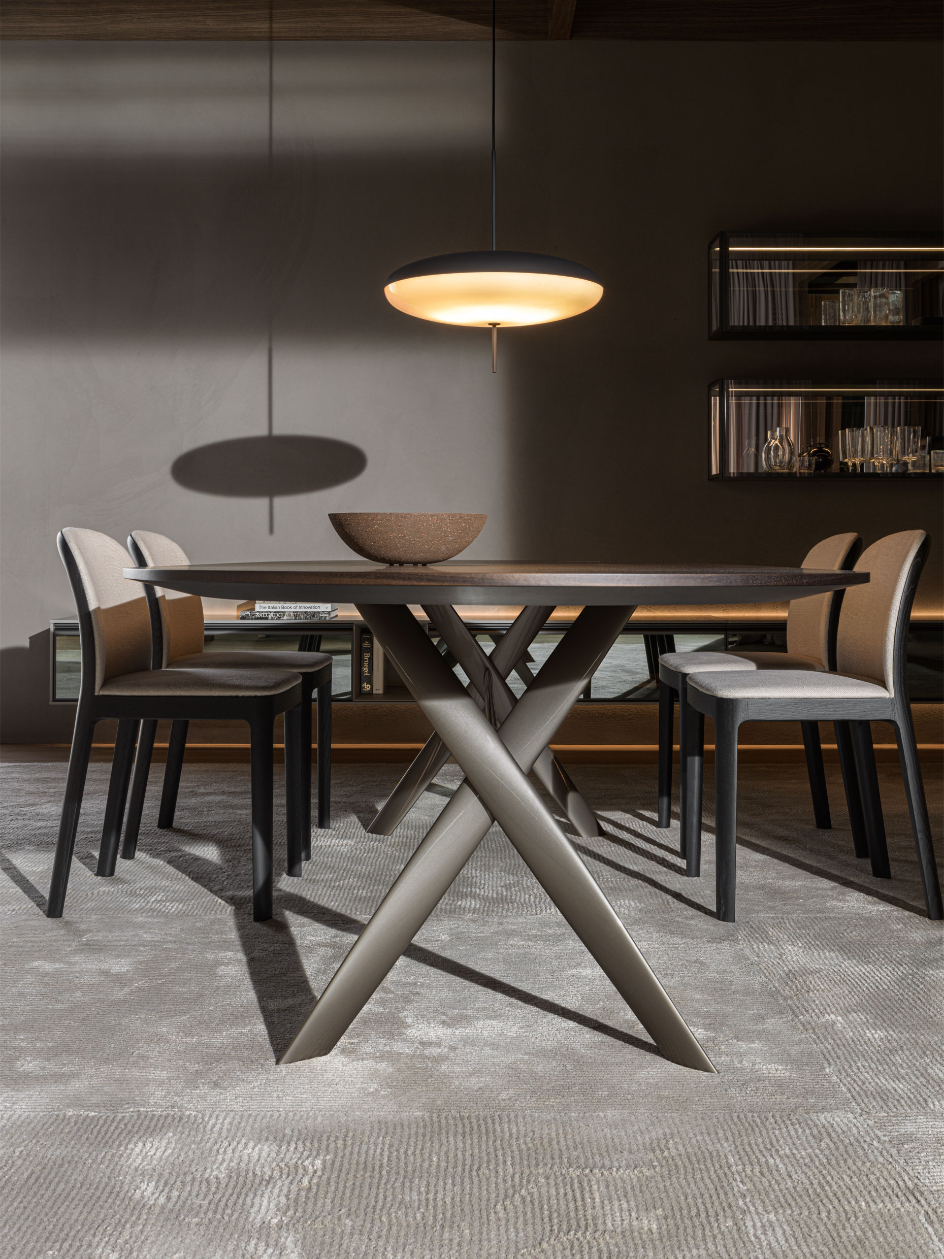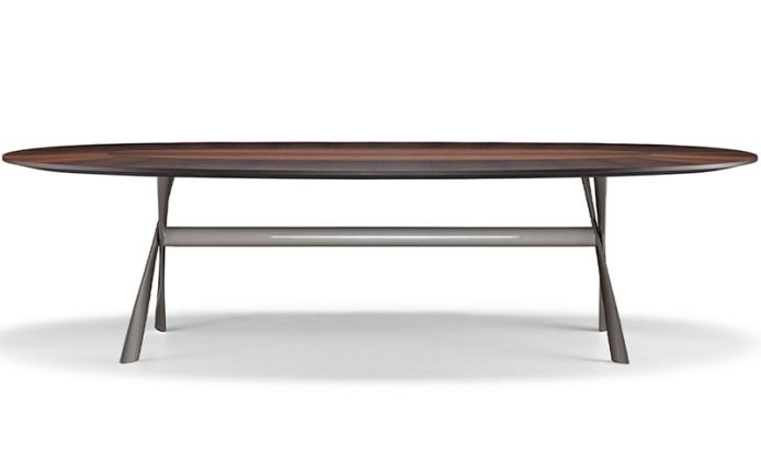 This table takes the name of London’s Gatwick airport, one of the busiest in the world. It is the particular structure of twisted and criss-cross steel recalling an airplane propeller or a helicopter blade that inspired the name. The aluminium frame in several contemporary finishes, supports elegant rectangular or oval tops of different sizes.