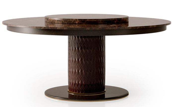The round table from the Numero Tre collection is available to order in two diameters, the central cylinder supporting the table top is entirely covered with embroidered leather, the table top can be made with or without a rotating top, made of wood in a glossy lacquered finish or marble according to our samples. The Numero Tre table is available to order in various finishes according to the samples.