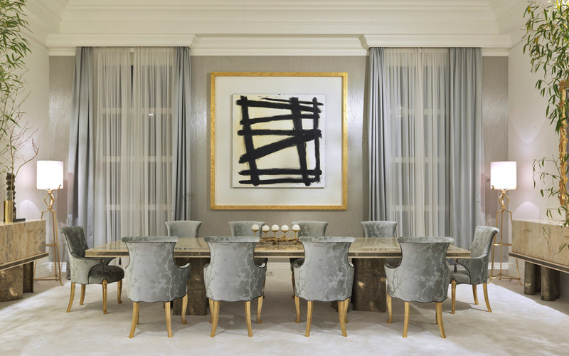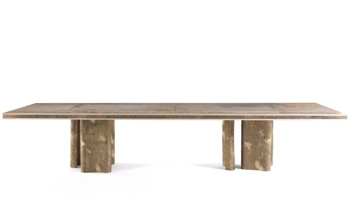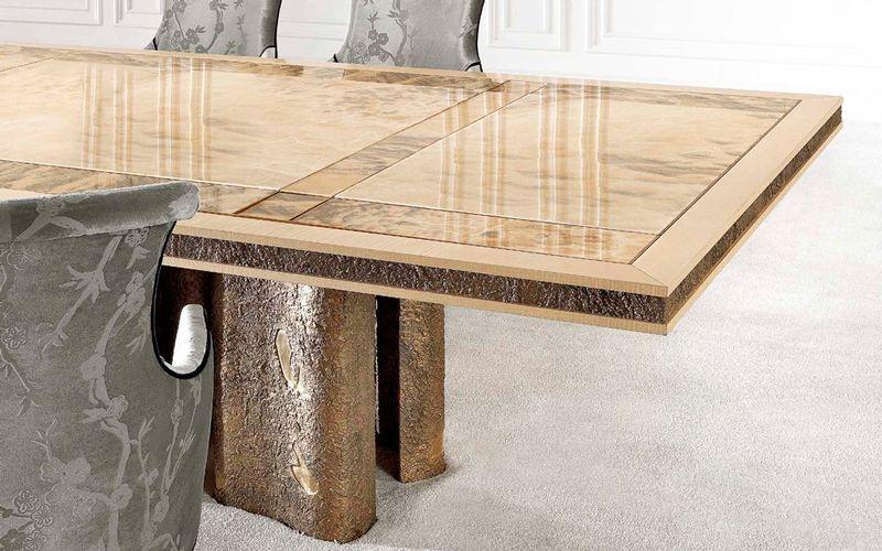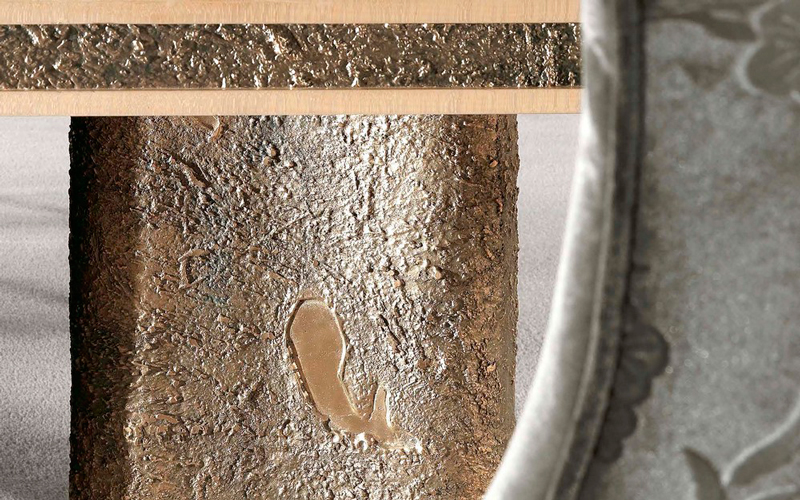 Characterized by sculptural shapes, the pieces of furniture of the Shinto line combine the essence of classic style with a contemporary allure. The pieces are distinguished by an original combination of materials, including natural maple, precious marble and brass casting. The parts in brass castings, with their materic appeal, contrast with shiny components in onyx or marble, enriched with refined decorations in gold leaf. All the pieces are characterized by an important artisanal component: the manufacturing mixes the use of experimental techniques with traditional methods handed down for centuries.