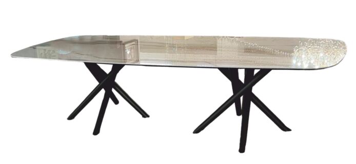 Created by designer Ollen Pal, this designer dining table has an intricate painted metal base that immediately catches the eye thanks to the original weave of the legs. The table tops, which can also be made of ceramic, wood or marble.