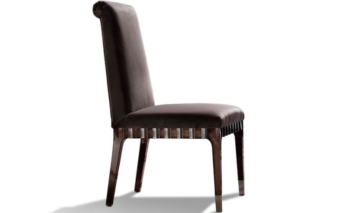 Open configuration options Side chair with solid beech wooden base and back and seat available in first grade leather, nabuk leather, velvet or suede fabric. 2 front legs with chrome stainless steel feet.