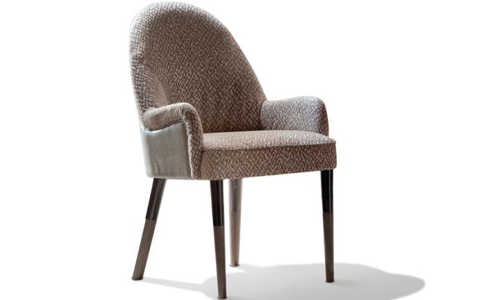Arm chair in solid beech wood in high gloss polyester, available in first grade leather, lizard printed leather, nabuk leather, velvet, velour or suede fabric, back in silver lizard printed leather. Base in combination of stainless steel in storm dark grey finish and solid beech.