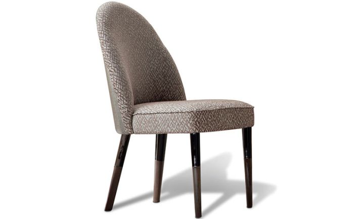 Side chair in solid beech wood in high gloss polyester, available in first grade leather, lizard printed leather, nabuk leather, velvet, velour or suede fabric, back in silver lizard printed leather. Base in combination of stainless steel storm dark grey finish and solid beech.