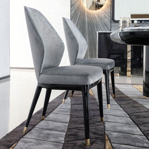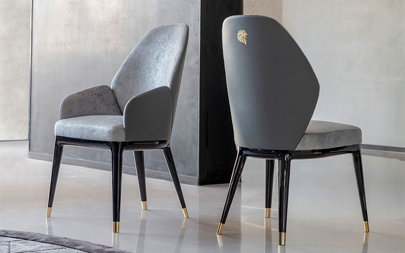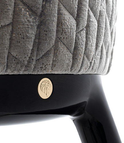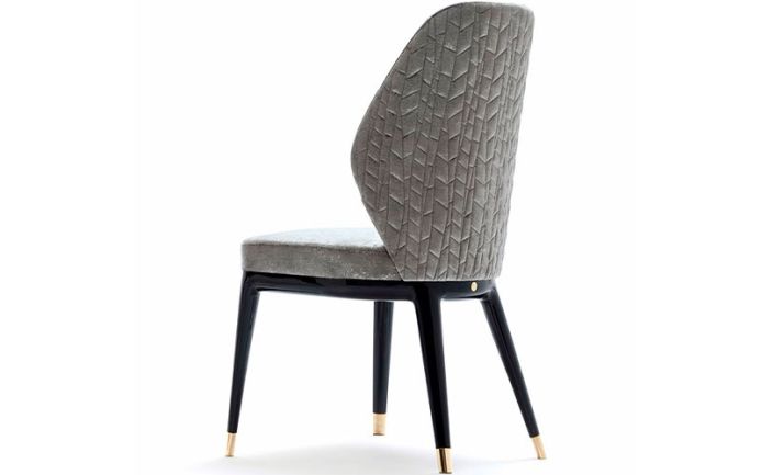 Fully upolstered side chair in solid beech. 4 legs with details in gold chrome stainless steel. Wooden base with Giorgio Collection metal logo.
