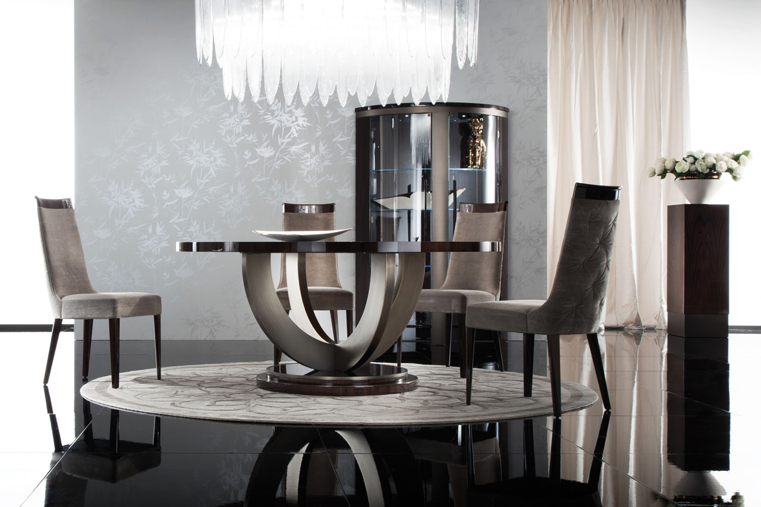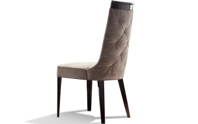 Side chair in solid beech wood in high gloss polyester, in Brazilian rosewood colour w/buttoned back in first grade leather or lizard printed leather / in velvet, velour or suede fabric / in nabuk leather.
