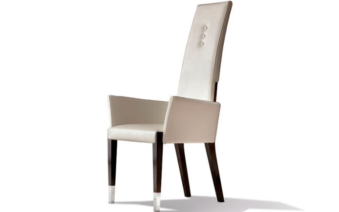 Armchair with solid beech wooden base and back and seat available in first grade leather, nubuk leather, lizard printed leather, velvet or suede fabric. 2 front legs with chrome stainless steel feet.