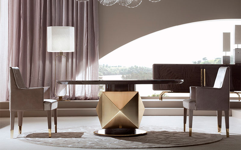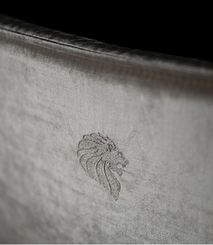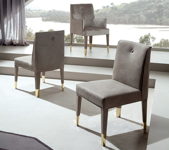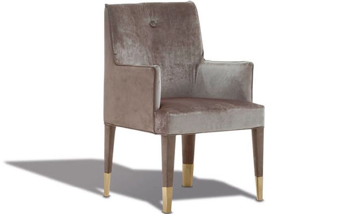 Fully upholstered arm chair. Back with Giorgio Collection logo. 4 legs in light gold chrome stainless steel.