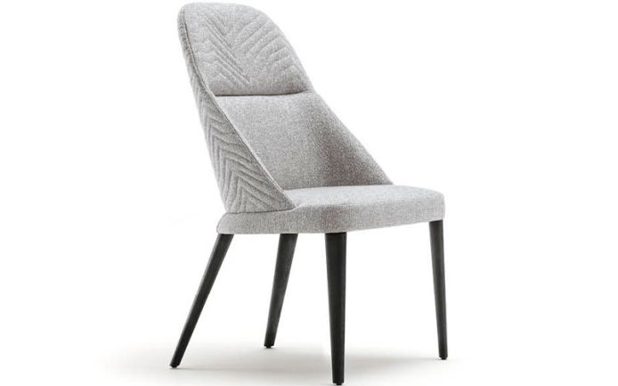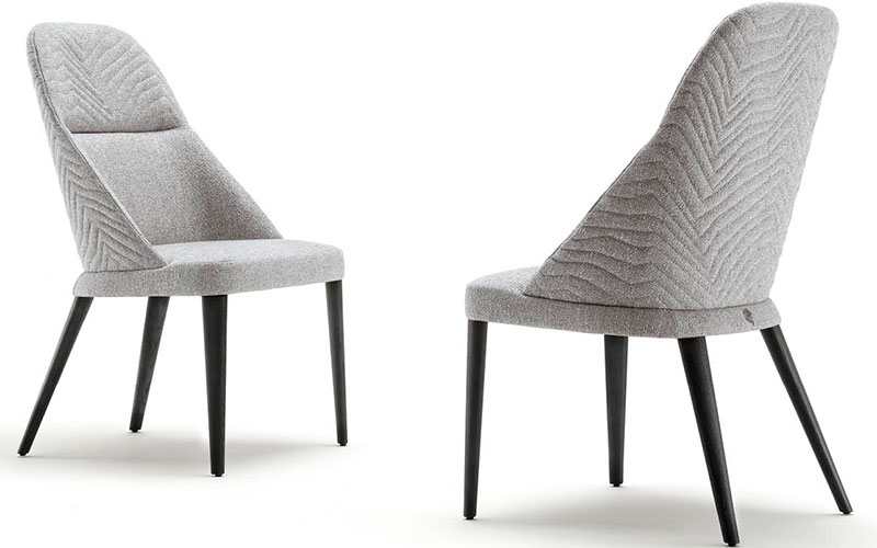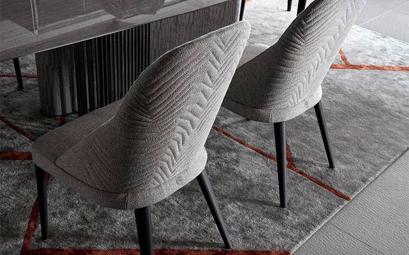 Fully upholstered armchair in solid oak. Back in quilted first grade leather, nubuk leather, lizard printed leather, velvet or suede fabric. Upholstered base with embroidered Giorgio Collection logo. 4 legs in satin open grain oak.