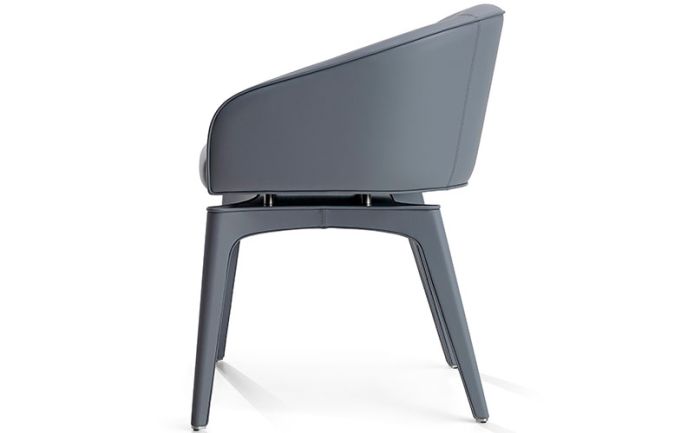 Chair upholstered in leather or fabric. Multilayer curved wood shell, with a seat frame equipped with elastic strap suspension. 4-leg solid wooden base upholstered in leather or fabric, with the upper surface made of stainless steel.