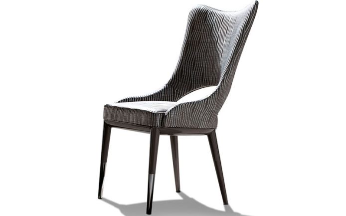 Arm chair with high gloss polyester grey lacquer base. Seat and back completely upolstered. 2 fronts legs in black nickel steel insert.