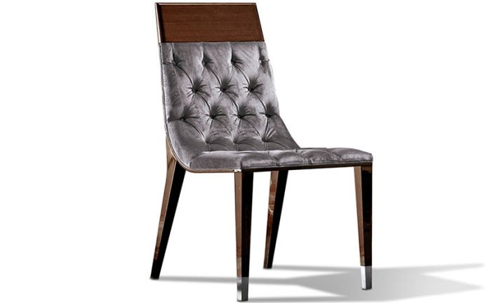 Side chair with or without buttoned back and seat. 2 front legs with chrome feet. Available in leather / in velvet or suede fabric / in nubuk leather.