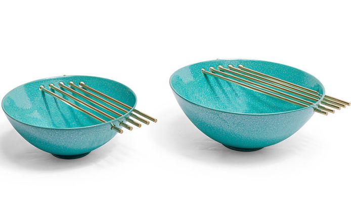 Ceramic zen bowl, turquoise crystal Ø 30 with holes, 5 brass rods 34,5 Ø0,7 cm. Ceramic zen bowl, turquoise crystal Ø 30 with holes, 5 brass rods 38,5 Ø0,7 cm.