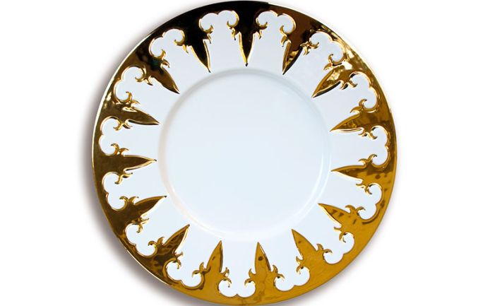 Artistic ceramics enriched by an embossed decoration on the border, “Visionnaire” logo in fine gold or platinum, applied by brush and fire baked. Internal colour white.