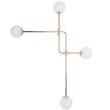 Wall lamp with structure in cylindrical section iron rods. Wall anchoring system in iron. Gold finishing. Shades in natural satin glass. Halogen light bulbs.