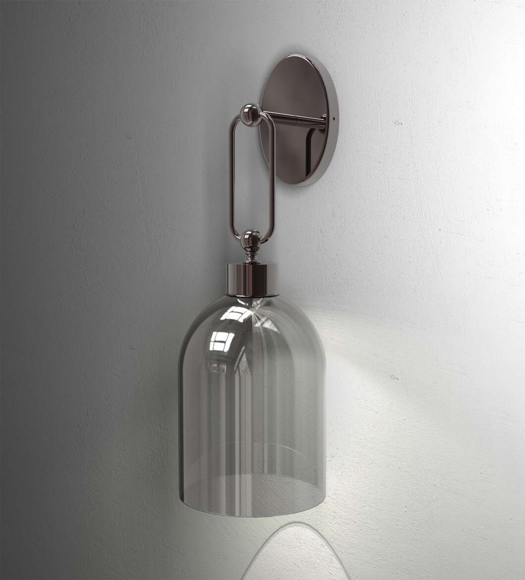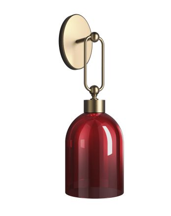 A wall lamp made of metal with a gray iron or matte gold finish and a diffuser made of red or smoky glass.