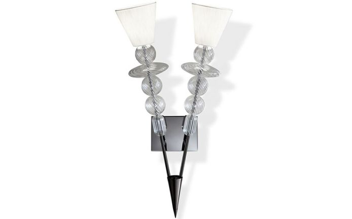 Venetian "Murano" blown clear glass wall light. 2 "Murano" blown clear glass arms with 2 E14 lights inserted in a black nickel steel.