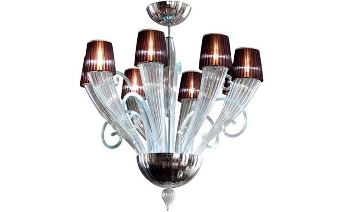 Venetian “Murano” clear blow glass round chandelier. Details in silver leaf blow “Murano” glass. 8 lights with shades in brow silk. 2 different light switches.