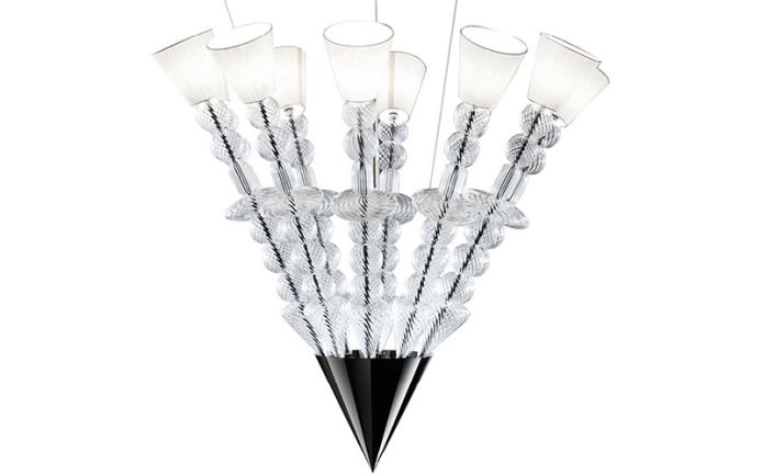 Venetian "Murano" blown clear glass round chandelier. 10 "Murano" blown clear glass arms with 10 E14 lights. Base in a black nickel steel.