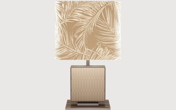 Metal structure. Decorated with quilted leather tiles. Available with fabric lampshade.