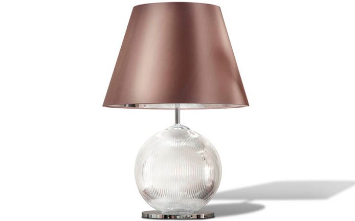 Medium lamp in combination of base in chrome stainless steel and Venetian "Murano" clear blow glass. Shade in brown satin silk.