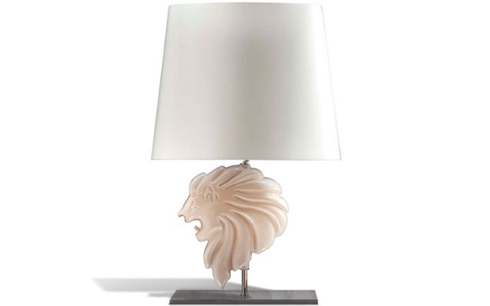 Ceramic Lamp in beige/brown colour with "Giorgio collection" lion. Chrome stainless steel base. White satin silk shade.