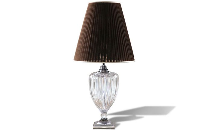 Lamp w/base in combination of "murano" clear blow glass and chrome stainless steel. Shade in black/brown silk.