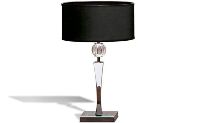 Small lamp w/chrome stainless steel base and “murano” clear blow glass ball. Black shade